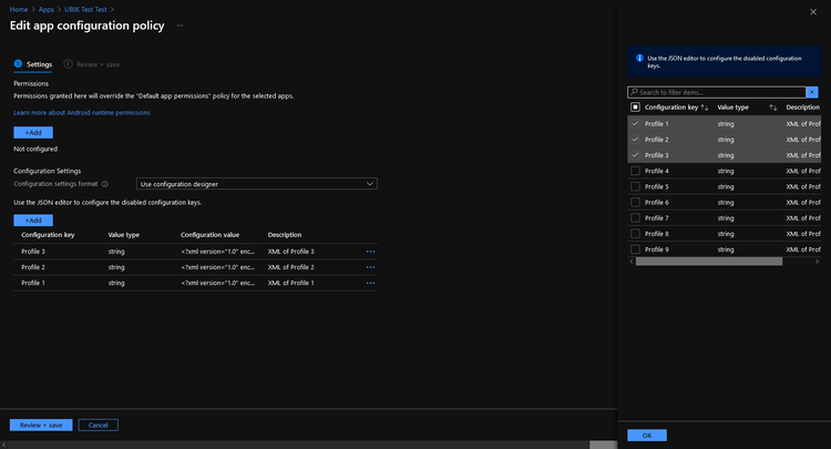 For Intune, an Application Configuration Policy can be defined. It is possible to limit the scope of this policy to groups, devices, and even device management types. In the Configuration Designer, the desired values can be chosen, but for UBIK®, all of them do the same and only differ by the number. For other EMM systems, this might be different, but you should end up with something similar-looking: